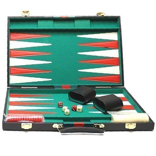 A beautiful backgammon set comes in a stylish black vinyl case with green/red striped labeling and features a green felt interior with red and white playing fields to match the red and white playing pieces. Contains game pieces, 2 dice cups and white and red dice