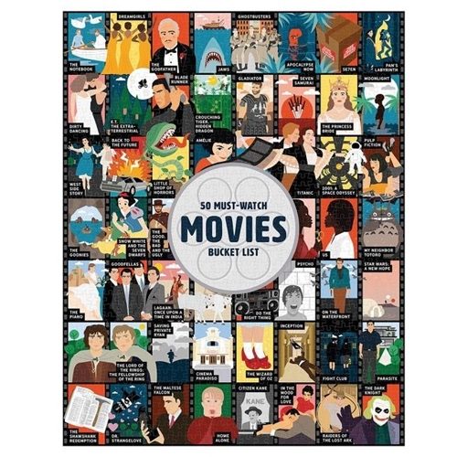 As you piece together this 1000-piece 50 Must-Watch Movies Bucket List puzzle from Ridley's Games, you'll uncover 50 classic titles from various genres to inspire fun family movie nights at home. Featuring beautiful illustrations inspired by classic and blockbuster films like Ghostbusters, Parasite, Lord of the Rings, and West Side Story, this great gift for movie lovers offers a bucket list of incredible films to watch after piecing it together!