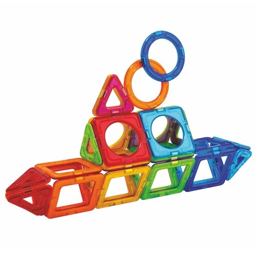 This new Magformers Basic Plus 30 magnetic construction set brings you two great new shapes –magnetic circles and squares with circle insides. These new shapes bring great new creativity to any 3D structure made using Magformers – like circular windows, portholes, or make believe ‘wheels’.