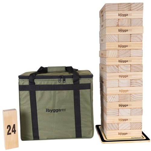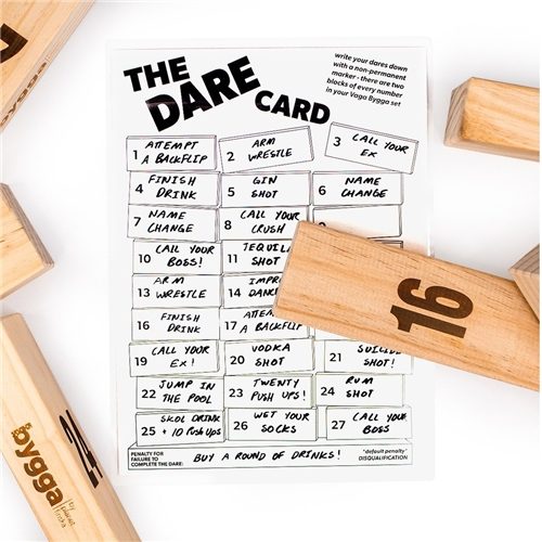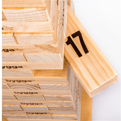 Includes 54 jumbo sized numbered timber blocks and a laminated dare card. Players make up 27 dares and write them down on the rule card. Once a player pulls a block from the tower, they must complete the dare that correlates with the number on that block – or face the penalty for incompletion! Of course if dares aren't your thing, you can always continue to play Bygga the classic way we all know and love.