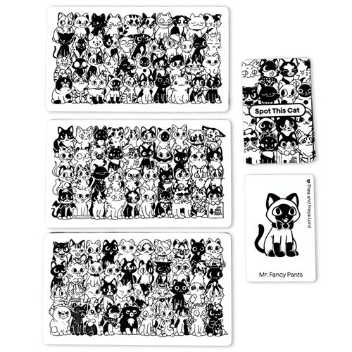 Cat Spotting is a fun and fast game where the objective is simple: be the first player to spot the hidden cat in the crowd! These games are best played with 2 players, but can be enjoyed with more.