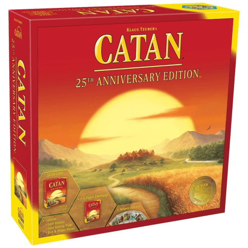 The CATAN 25th anniversary edition contains the classic CATAN 3-4 player board game, PLUS 5-6 Player Extension, Helpers of CATAN Scenario, special iridescent anniversary wood pieces and dice. Also includes resource card sorting trays and card sleeves!