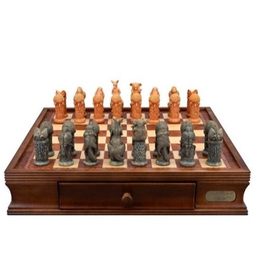 A beautiful set of hand painted resin chess pieces using well known Australian animals figures as well as the Sydney Opera house on a Dal Rossi wooden walnut finish chess board with drawer. A treasured edition to any study or games room, and a great gift idea for the serious chess player.