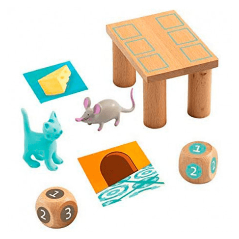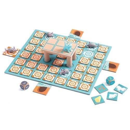 A semi -cooperative strategy game for mice players: One player plays the cat, the others, the mice. Alternately, one mouse plays, and then the cat. The mice need to collect ten pieces of cheese, whilst the cat tries to catch the four mice. On your turn, roll the dice, move forward the corresponding number of squares, and turn over the tile of the square you land on. Then carry out the action indicated on the tile (cheese, broken plate, +1, +2, a Super Move, etc.). If a mouse turns up a piece of cheese, it can keep it. If the cat lands right on the square where a mouse is sitting, it catches it