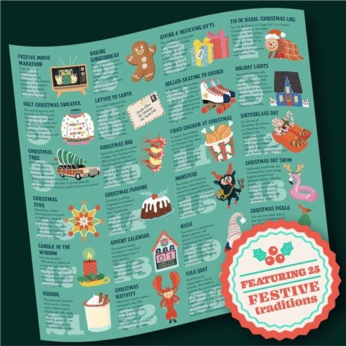 From puddings to pickles, Sinterklaas to swimming, and yule logs to yule goats, this jigsaw celebrates some of the greatest Christmas traditions from around the world.