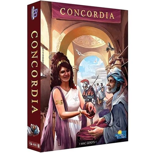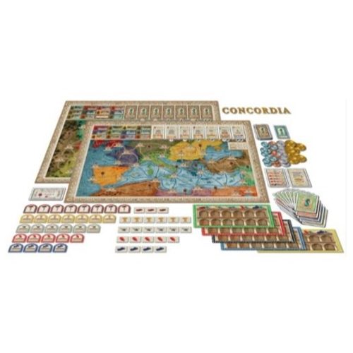 Concordia is a strategy game that requires advance planning and consideration of your opponent's moves. Every game is different, not only because of the sequence of new cards on sale but also due to the modular layout of cities. (One side of the game board shows the entire Roman Empire with 30 cities, while the other shows Roman Italy with 25 cities for 2-4 players.) When all cards have been sold or after the first player builds his 15th house, the game ends. The player with the most VPs from the gods (Jupiter, Saturnus, Mercurius, Minerva, Vesta, etc.) wins the game