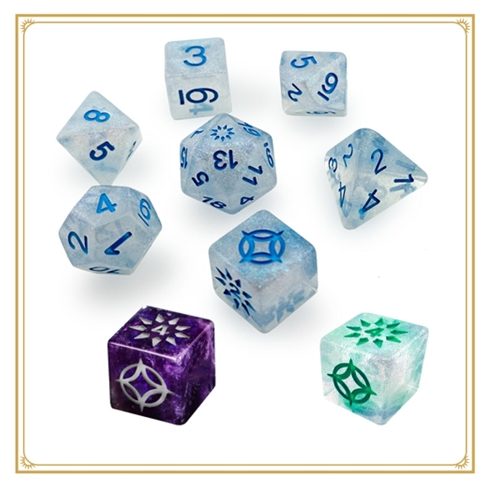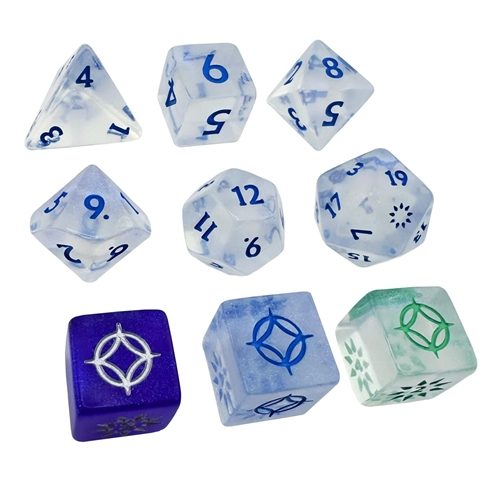 A set of sparkly Stormlight-themed blue and white die that includes all the dice you need to play the Cosmere® Roleplaying Game: six standard RPG dice plus three custom plot die in a blister pack.