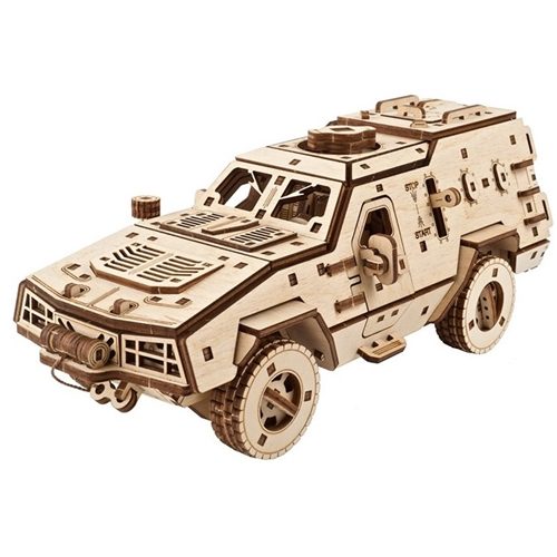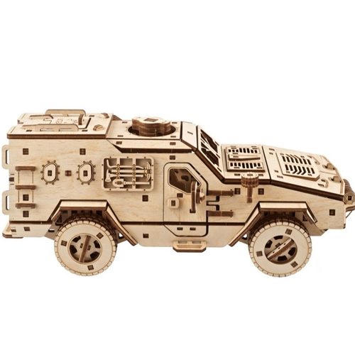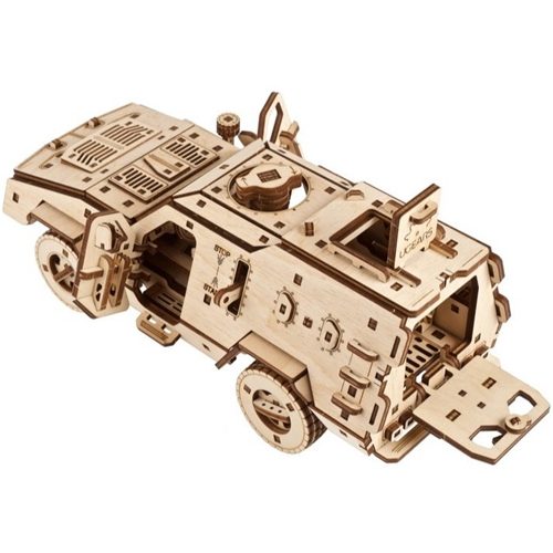 The Ugears Dozor-B Combat Vehicle DIY model is also proudly made in Ukraine. It has “armor” in the form of 3.7 mm-thick plywood, all-wheel drive, full suspension, and a spring motor that allows it to travel a considerable distance (about 8 metres). Because this is Ugears, and because we love to delight and amaze our fans with cool extras, the Ugears Dozor-B Combat Vehicle features a working winch, just like its real world analogue, for self-recovery or recovery of vehicles of similar weight. Pull the front bumper-mounted winch out, hook it to an object, and watch it pull the Dozor-B forward!