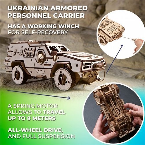This DIY wooden model of a Ukrainian armed forces armoured personnel carrier will make a worthwhile project or an original gift for anyone interested in military models, military history, four wheel drive trucks, combat vehicles, and for those who support Ukraine's efforts to preserve our freedom and independence against Russian aggression.