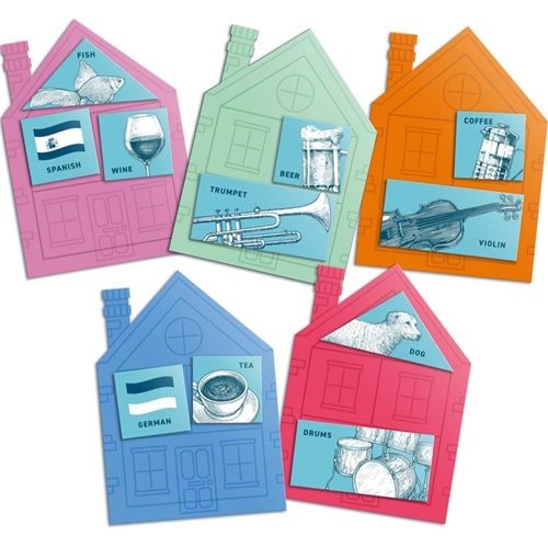 Can you solve this riddle by placing the pieces in the correct houses? This ultimate test of brainpower has you follow 15 clues to figure out which house each of the people, pets, drinks, and instruments live in, to finally discover who owns the fish! It's said that only 2% of people can solve this puzzle – can you?