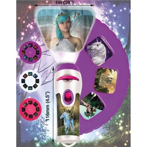 Transform your room into a magical fairy land with this fantastic projector torch. Simply shine the torch around your room and view beautiful images of fairies, unicorns and their magical homes. Project 24 colour fairy and unicorn images onto walls and ceilings in a dark room. Includes three slide discs and 24 fairy and unicorn images in their magical homes. Creates clear, precise images up to one metre wide – just twist the lens head to focus