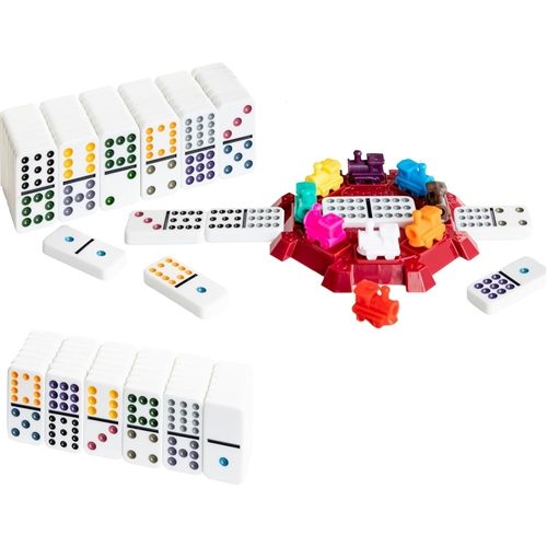 The popular game Mexican Train Dominoes has players working to get rid of all the dominoes in their hand. Play them from the central hub onto a train and carefully build its tracks! This tin contains 91 crystalline dominos, plastic trains and a plastic train hub.