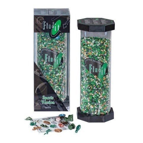 Find It Sports Edition! We call this a contained adventure! It features 35 different types of sports and over 40 challenging items for you to find.Spin it, twist it, shake it, be the first to find the hidden penny, racing flag, boxing gloves, ping pong paddle. Find It can be played alone or as a timed game with friends.