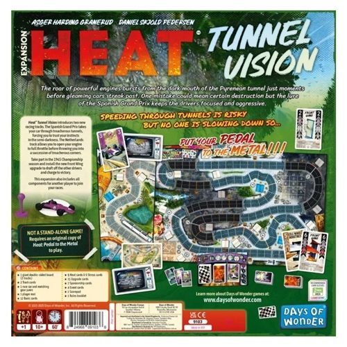 This second expansion brings chicanes and tunnels for more technical and high-intensity races, front wing upgrade cards, and new event cards, in addition to expanding the player count to seven (or eight with the Heavy Rain expansion).