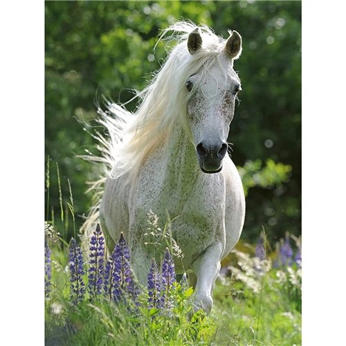 Join a beautiful white horse playing in the fields in this puzzle full of wildflowers!