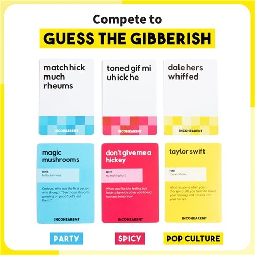 Incohearent is the adult party game by What Do You Meme™ that will get you talking! Let the laughs begin as you compete to make sense out of gibberish from one of three categories — kinky, party and pop culture. This new, spicier edition features updated content to keep the party going even longer!