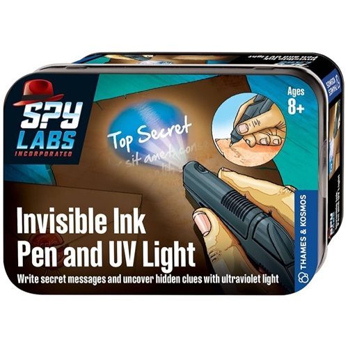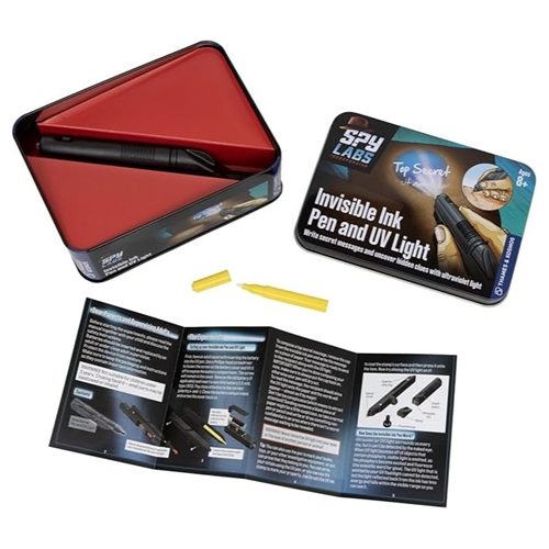 As a detective, you need the right equipment for when you are on the hunt for evidence or reading secret messages. Ultraviolet light helps you uncover many hidden clues. Exchange top secret info with your friends and fellow agents using this high-tech device. The pen uses a special ink that only becomes visible under ultraviolet light, like the one emitted by the flashlight on its opposite end. You can also use the UV light to find other objects and materials that glow.