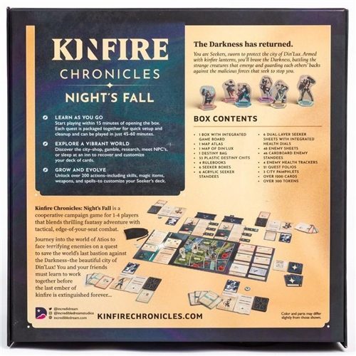 Kinfire Chronicles: Night's Fall is a co-operative campaign game for 1-4 players that blends thrilling fantasy adventure with tactical, edge-of-your-seat combat. Play as one of six unique Seekers, sworn to protect the city of Din’Lux and help rebuild the world beyond. Armed with kinfire lanterns, you’ll brave the Starless Nights, battle the creatures that emerge, and guard each others’ backs against the malevolent forces trying to stop you.