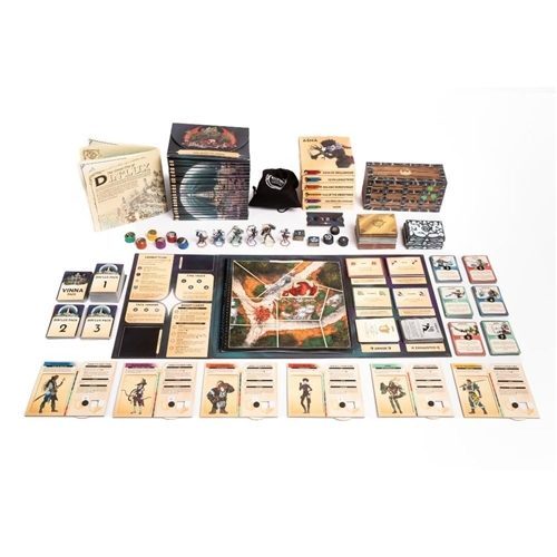 Each quest has three phases: adventuring, battle, and exploration. In the adventuring phase, players make choices based on options presented on the quest cards and need to accomplish something (such as crossing a river or chasing down a suspect) by flipping the correct number and color of cards from their decks. In the battle phase, players work together to defeat enemies on a physical battle map. Turns are determined by drawing chits out of the destiny bag, with each enemy having numbered tokens that correspond with different attacks and actions. Players may play action cards on their own turns to do damage and can play boost cards on other players' turns to do things like reduce damage, move players, or even return a drawn chit to the destiny bag for redraw. The game doesn't end if an objective isn't achieved or an enemy defeats the heroes, but it will affect later gameplay and choice options. Lastly, on certain quests players can return to the city in the exploration phase to speak to NPCs, purchase items, and level up their decks.