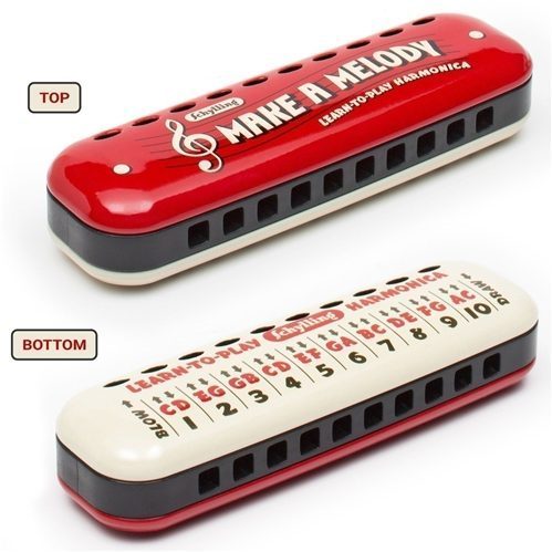 Schylling's Learn To Play Harmonica is a quality beginner's instrument that remains inexpensive. Tuned in the key of C, the Blues Band harmonica sounds great for any style of music. Pocket sized and with no snag edges, this colourful tin harmonica has easy to read music chart printed right on it!