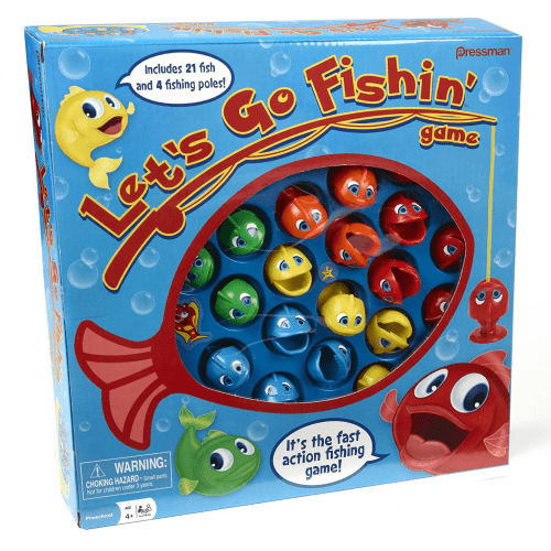 This classic kids game teaches hand-eye coordination as players use their mini fishing poles to try to catch the most fish. The challenge is that the board game spins, and the fish open and close their mouths. With 21 fish and 4 fishing rods, there’s plenty of fishing fun in this fast-paced competition, and these fish are as hungry as hungry hippos. Let’s Go Fishin’ is a fishing toy that’s great for playing at home or as a travel game–it will lure kids into playing over and over again.
