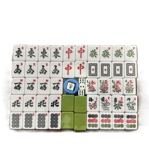 This Mahjong set contains 148 tiles with green coloured backs, including 4 that are blank, 3,dice and wind direction in a convenient vinyl case.