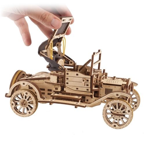 Ugears' team of engineers and designers have developed a special, classic car model to take you back to that age. Outstanding features include the functional convertible folding roof with fabric overlay; latching cab doors that open to the front; the hood that opens on both sides, revealing a functional 4 cylinder engine with crankshaft; a skeuomorphic pendulum that simulates the sound of a rumbling motor; front wheels that turn using the steering wheel; and a spare wheel mounted at the back. To operate the Retro Car UGR-T, set the Start/Stop button to "Stop" as you wind the spring-powered motor using the built-in ratchet key under the chassis. Place the model on a flat surface as you hold it with one hand, press "Start," then release and watch it go. The car has Forward, Neutral, and Reverse gears.