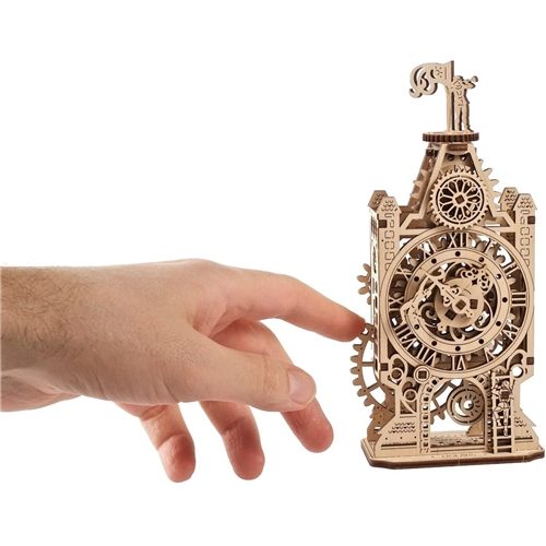 The Old Clock Tower mini-model by Ugears brings a charming medieval atmosphere into your home or office. This beautiful DIY wooden clock tower model is a mechanical mechanism in the form of a tower with clock face, moving gears, a moving pendulum, whimsical characters, and a weather vane on top. Scroll the large gear to set the hands of the clock, the pendulum, and the weather vane in motion. The weather vane is a trumpeter holding on to a banner blowing in the wind. For comic effect, a man is suspended from the clock's spinning minute hand, holding on for dear life. Another man climbs a ladder below the clock—perhaps a cleaner or clock repairman? Behind the clock a suspicious-looking figure enters a hidden door—a thief storing his loot in the clock tower, or maybe a hunchback, bringing his lunch back? Invent your own story as you spin the gears and watch the mechanism come to life.
