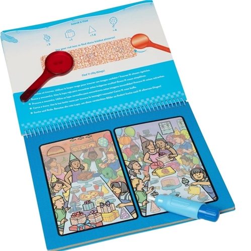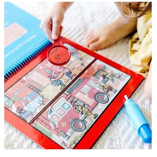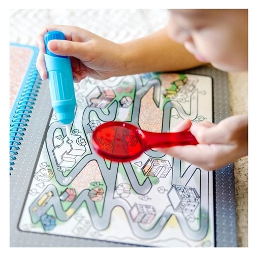 - 8 spiral-bound around town-themed coloring boards (toy shop, town maze, classroom, baseball game, fire station, grocery store, birthday party, beach), refillable water pen, and red lens