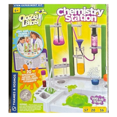 Grab your beakers and test tubes and step up to your special laboratory station for some exciting chemistry experiments. See how much fun chemistry can be as you do slimy, fizzy, colorful, and bubbly experiments. This cool laboratory setup has lots of different vessels and pieces of lab equipment so kids can play the role of chemist while doing real, safe experiments. All of the experiments use non-hazardous chemicals.