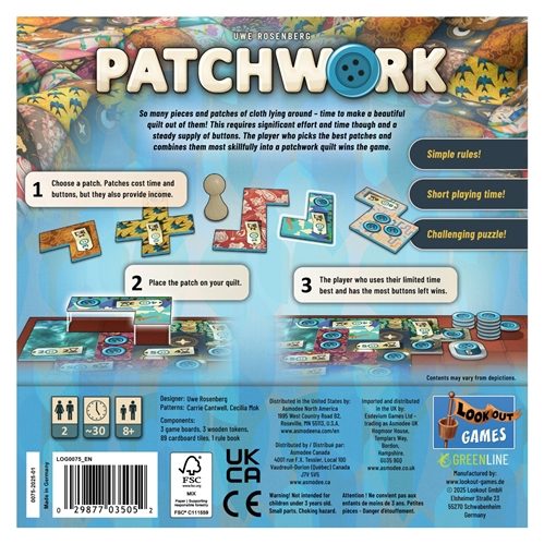 In Patchwork, two players compete to build the most aesthetic (and high-scoring) patchwork quilt on a personal 9×9 game board. To start play, lay out all of the patches at random in a circle and place a marker directly clockwise of the 2-1 patch. Each player takes five buttons — the currency/points in the game — and someone is chosen as the start player.