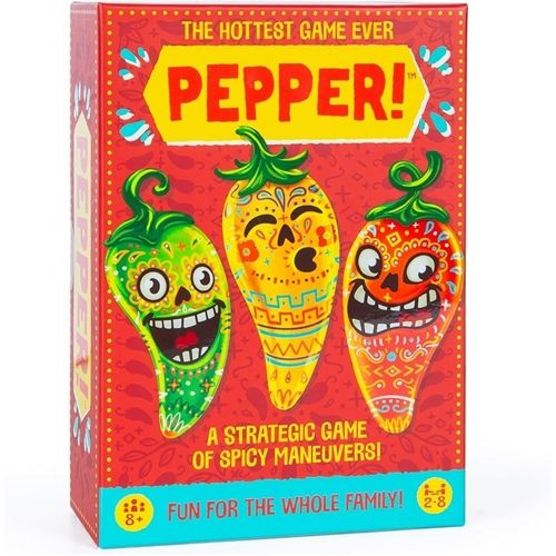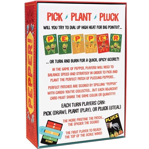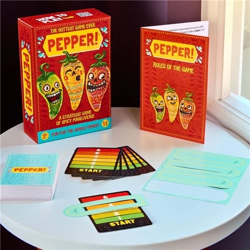 In the hottest game ever, Pepper, you will need to balance strategy and speediness so that you can pick and plant the perfect patch of playful peppers. Score your perfect patches by spelling "PEPPER" with the cards you collect – but don't get puzzled by the rule that each adjacent card must have the same colour or quantity! First player to reach the top of the scale wins!