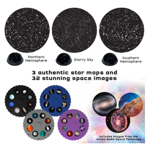 The Planetarium Projector turns your bedroom into your very own planetarium theatre! Illuminate a darkened room by casting projections of the stars in the night sky and space-themed images across the ceiling and walls. This home planetarium is actually two projectors in one.