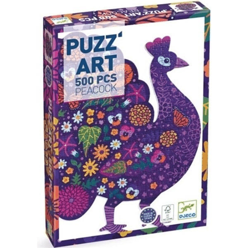 A gorgeous Peacock shaped 500 piece artistic puzzle with a royal purple colour.