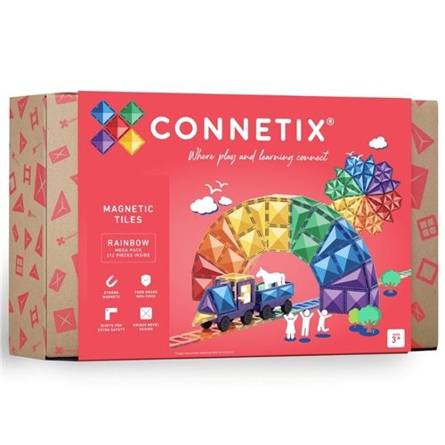 Allow children to unleash their imagination, take the lead in their play and create the ultimate rainbow fun! The CONNETIX 212 Piece Rainbow Mega Pack features every standard magnetic tile shape in 6 vibrant rainbow colours, as well as two purple car bases with REAL rubber wheels. The ultimate starter pack to set you up for limitless imagination and creation, this pack is the perfect option for siblings, family and friends to enjoy building MEGA CONNETIX creations together.