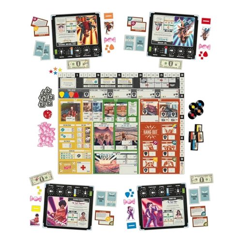 Designed by Jackie Fox, a veteran of the industry after being a member of "The Runaways" and illustrated by Jennifer Giner, this game takes you through a 9 round cycle of the year, from April to December. You win the game by accruing the most fame. How? Increasing reputation, chops and songs; achieving production, performance, and publicity bonuses; getting record deals and earning royalties; playing concerts; and hanging out at the hottest after-hours spot. Ready to live like a rock star?