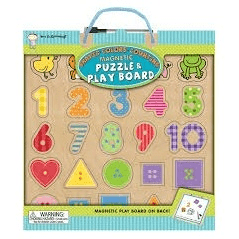 Kids will love to play with the colorful numbers, shapes, & animals, explore new words, and practice writing with this all-in-one puzzle and play board