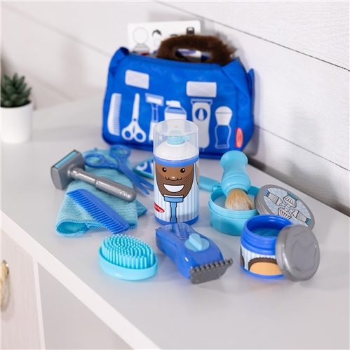 Kids can check their look in the hand mirror that flips to stand as they finish with textured pomade in a tub, comb, and brush. Includes a reusable double-sided activity card. Everything stores in a sturdy zippered shaving kit for easy cleanup.