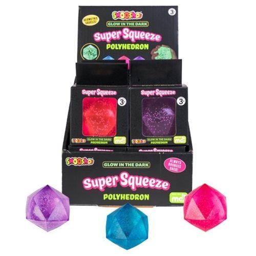 Get your hands on Smoosho's Super Squeeze Glow in the Dark Polyhedron! Its dynamic shape is ideal for firm, satisfying squeezes, with just the right balance of squishiness and strength. Turn off the lights and watch it glow! Mould it however you like, because no matter how slow, it will always return to normal. It's geometric fun!