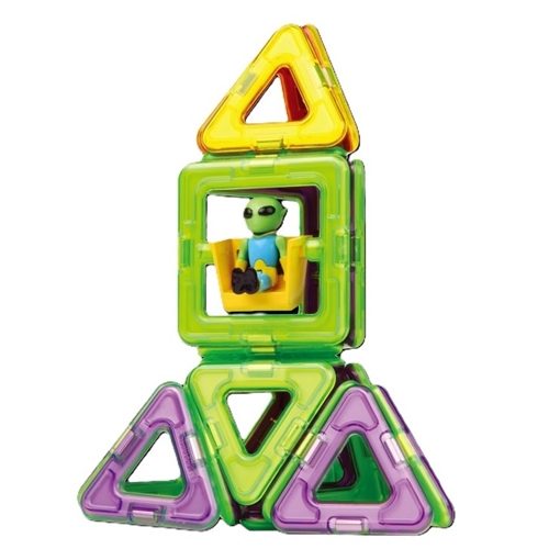 This set comes with 20 triangle pieces, 14 square pieces and a little green alien, to build spaceships and rockets.