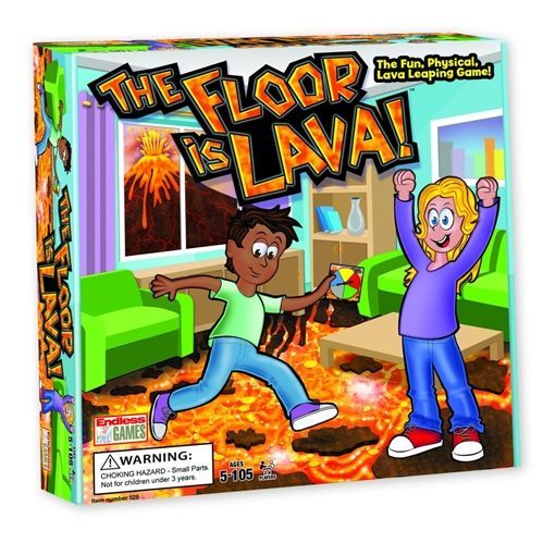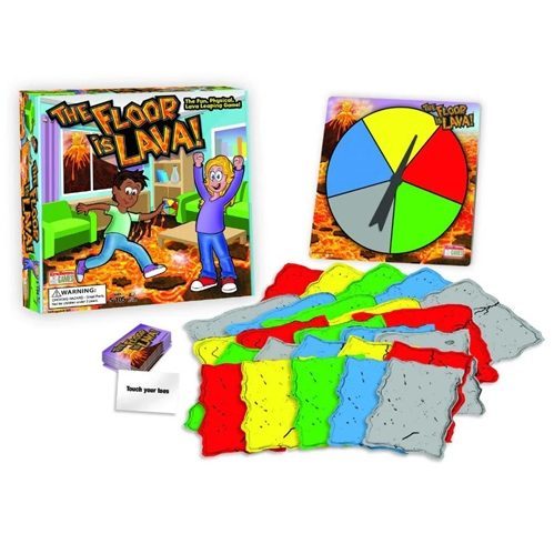 Everyone has played a version of this game as a child, most likely jumping all over the furniture in their living room trying to stay off the dangerous floor. The Floor is Lava is a brand-new game where players must imagine the floor is molten hot lava, while spinning for their color and jumping along foam game pieces in order to reach safety. The Floor is Lava is a family game incorporating physical activity, imagination and pure fun! Remember… DON’T TOUCH THE FLOOR!