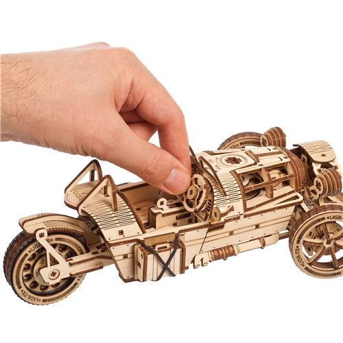 The Three-wheeler UGR-S is the latest and coolest addition to the Ugears collection of motorcycles and automobiles. This stylish two-seater is a three-wheeled road and attention hog, with spring drive, front and rear suspension, a functional steering wheel that turns the front wheels left and right, and loads of great detail like moving pistons, big headlamps, custom exhaust pipes running along the side, a suitcase to place in the side-mounted luggage holder, and laser engraving. And that’s not all—lift the two sides of the engine hood to see the gas tank and spring motor!