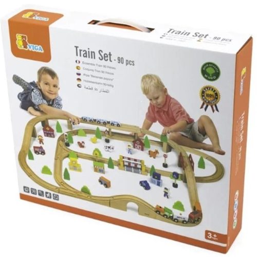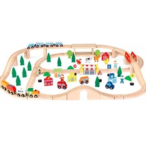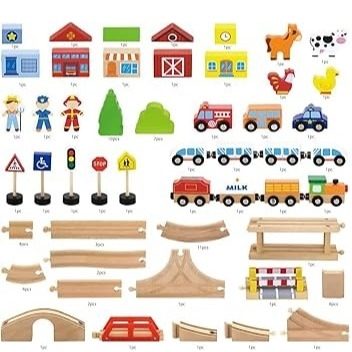 This 90 pcs train set consists of not only a modern passenger train, but also a cargo train, in addition to this are many farm houses, farm animals, trees, bushes and many other city blocks, such as a fire station, police station, school, grocery store, fire fighter, policeman, fire truck, police car, school busy and some traffic signs.