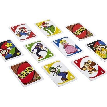 As in the UNO you love, UNO Super Mario gameplay involves players racing to get rid of all their cards, but this version features cards with Super Mario characters and images! And in UNO Super Mario, there's also a new type of action card, the Super Start Card!  When you're down to one card, don't forget to yell 'UNO!' Contains 112 cards plus instructions.