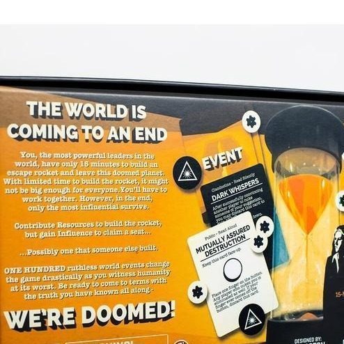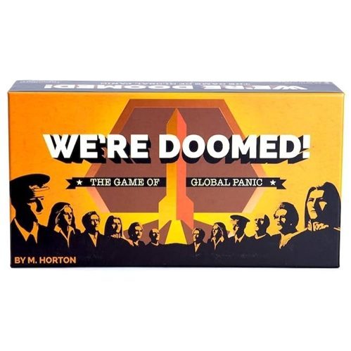 Players are the most powerful leaders in the world working together to build a starship. Time is short! The goal? Build and be on a starship that escapes a dying world — or betray everyone to ensure your own survival. No seats on the starship are guaranteed. We're Doomed! is a quick, timed, panic-inducing game of international collaboration, retaliation, diplomacy, conspiracy, and blowing each other up for fun!