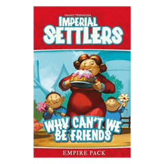 Imperial Settlers: Why Can't We Be Friends, the first Empire Pack for Imperial Settlers, includes new common cards for the central deck, new cards for each of the base game's four factions, and two new cards for use in the solo game with some factions. One new effect on the cards is "open production", an ability that allows an opponent to visit your building for the resource produced there while giving you the worker who made that trek. Hope you can put him to use once again!