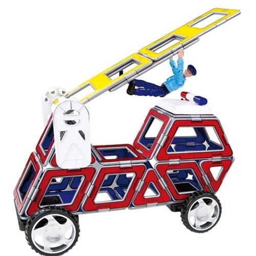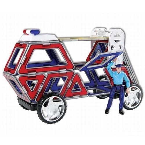 Your child can make police cars and fire trucks with this set made of red and blue shapes, wheels and other accessories, including working light / sound siren!