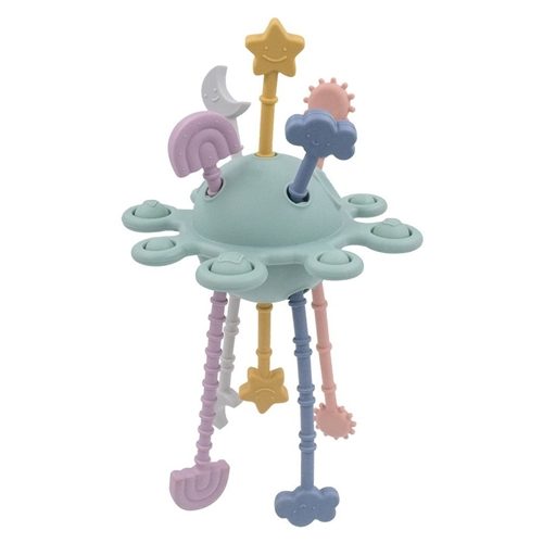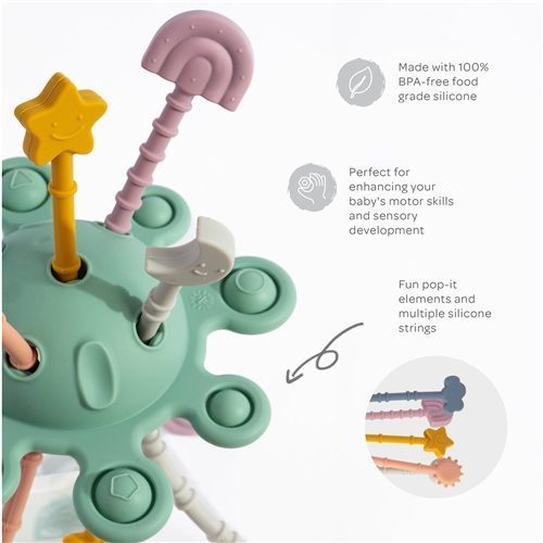Designed to promote tactile responses through pulling and pushing, it features fun pop-it elements and multiple silicone strings for baby to pull and tug at. With its creative design and interactive features, it's perfect for keeping little ones entertained when out and about.